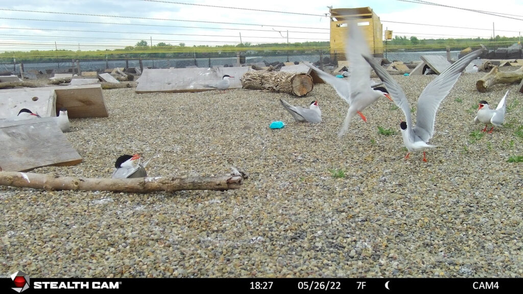 The colony faces several threats from predators, including mink, Night-Herons, and Great Horned Owls. Wooden structures are placed on the island for chicks to hide under for protection from predation as well as the elements.