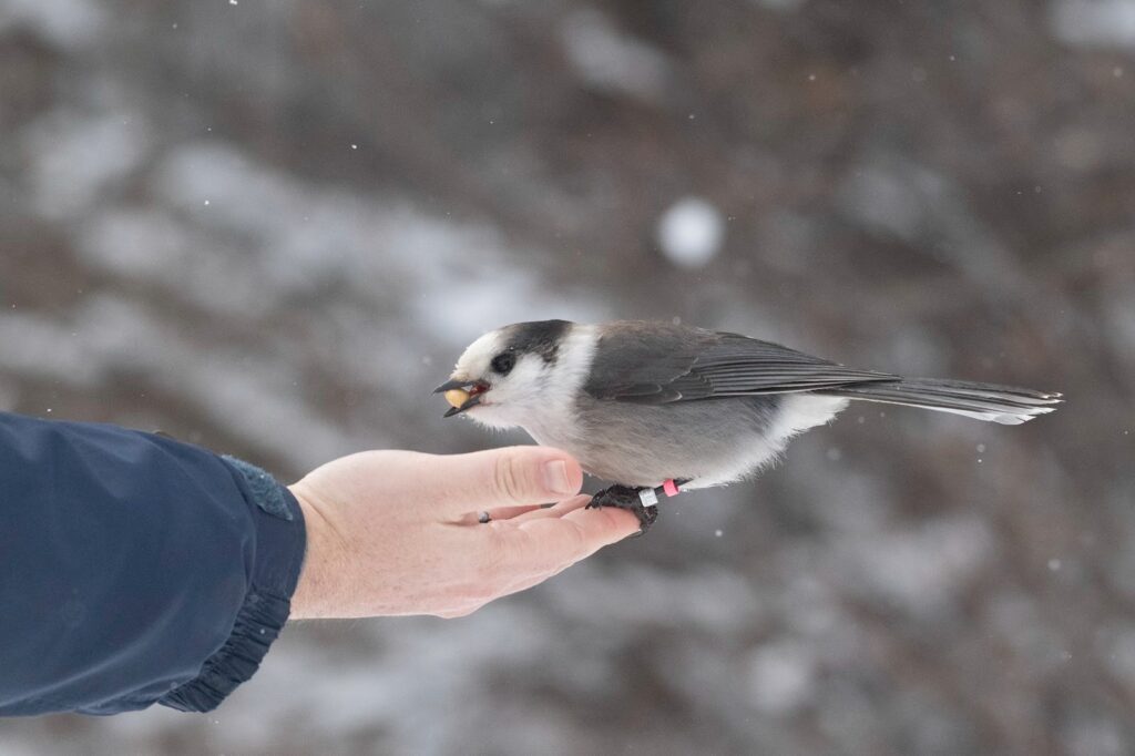 This was what many of the people on the trip signed up for: a chance to see a Canada Jay up close and have it take food from their hand.