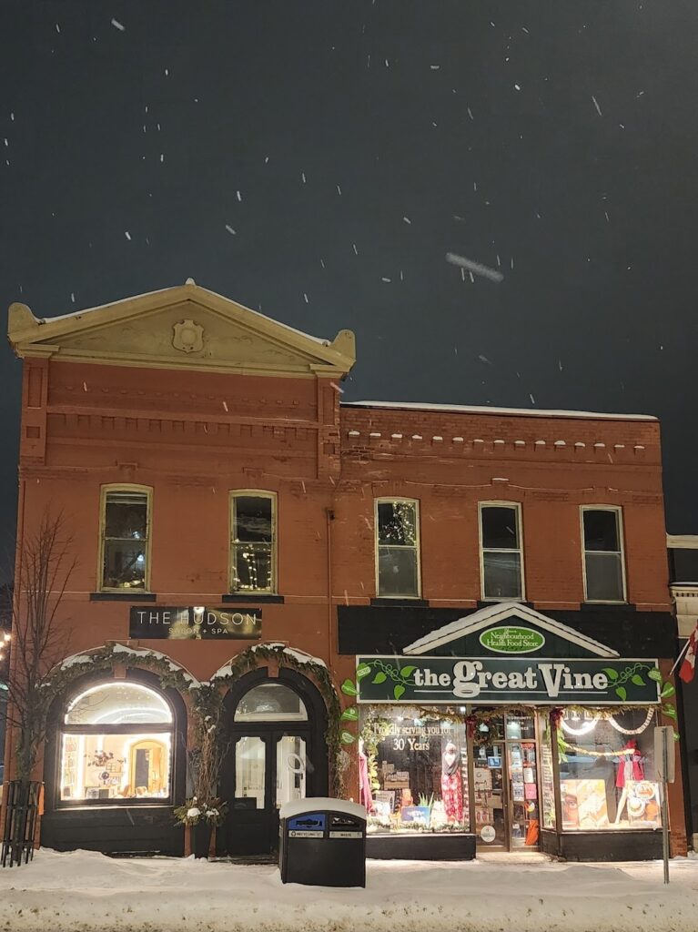 Since we were out to dinner, nobody had their binoculars or cameras. After dropping everyone off back at the hotel, Mike and I returned with three others in our group. It had moved from the utility pole to the top of a shop on Main Street—creating a picturesque scene of small town Canada. We climbed the steps of the town hall across the street for a better view.