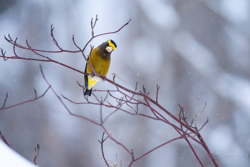 Our final stop was in Dwight, at the house of retired Algonquin Park Head Naturalist Rick Stronks and his wife Kelly. On last year’s trip, we were invited to see Evening Grosbeaks at his feeders that never showed, and when we announced the 2026 trip, Rick reached out and generously invited us again. When we arrived at his house, the trees above his house were loaded with chattering Evening Grosbeaks, and a lone Redpoll was visiting his feeder.