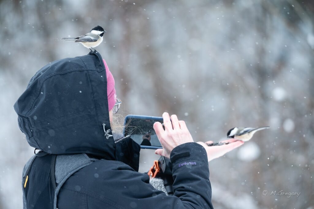 Some birds like Chickadees so readily take food from people it is considered to be a natural behavior. Some of us even had birds landing on our hats, binoculars, and cameras.