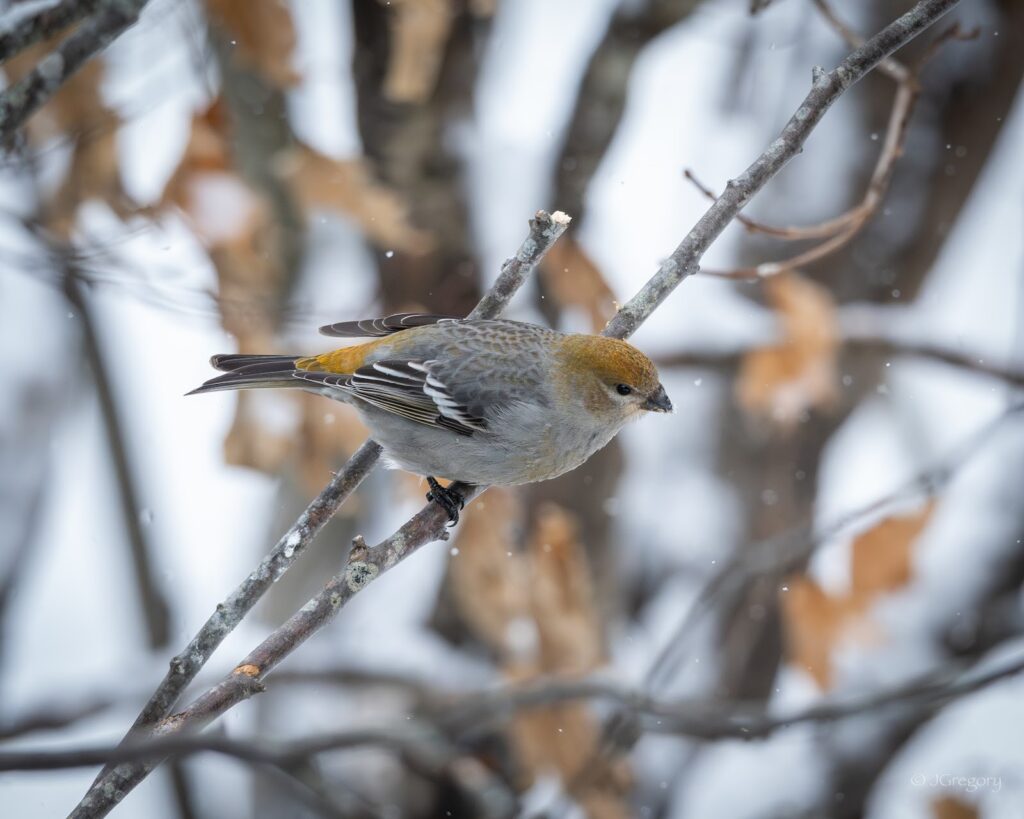 We went out to the observation deck of the visitors centre to find Pine Grosbeaks—a bird we were expecting to see. Algonquin Park hosts a livestream of their birdfeeders in winter that you can see here, so we had a pretty good idea of what would be there. Out of our five previous trips to Algonquin, we had only seen Pine Grosbeaks once. This was another life bird for many of us, and we were treated to great views of both the males and females.
