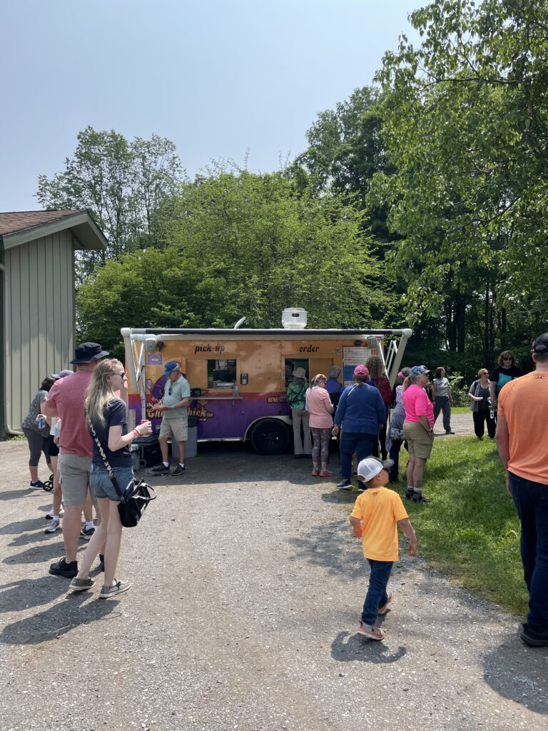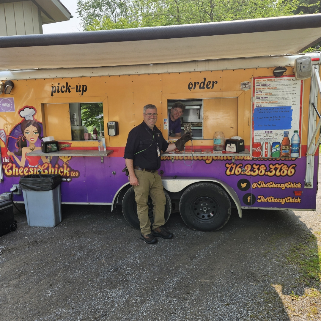 Lunch from the Cheesy Chick Food Truck is included with admission (one sandwich with or without meat, one side, and one soft drink; gluten-free, vegetarian, and vegan options are available). Two complimentary snacks (selection includes bananas, granola bars, and cheese sticks) are included with each paid admission. A water bottle fill station is available inside the nature center. Outside food and beverages are not allowed.