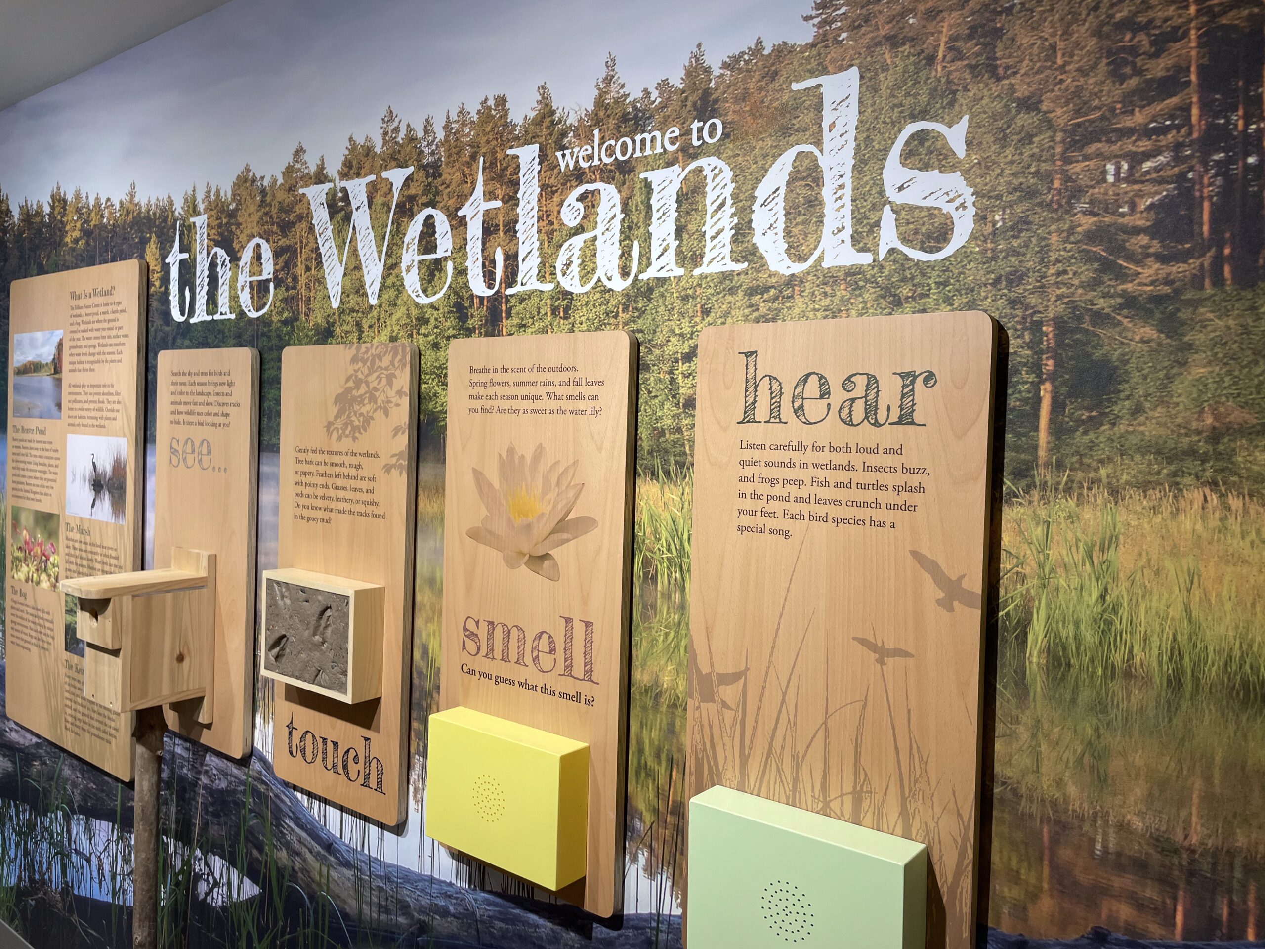 - Newly renovated Nature Center with interactive sensory and tactile exhibits, and first and second levels that reflect meadow and wetland ecosystems on the property